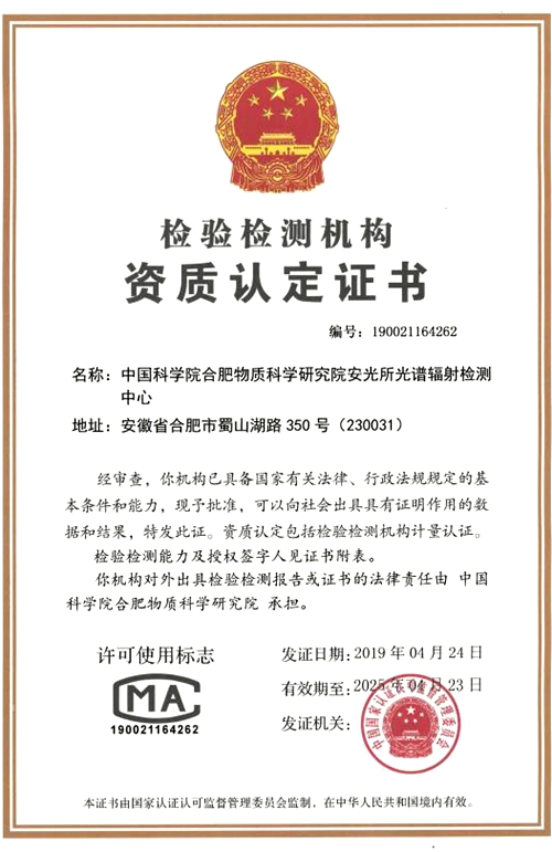 近日,中国科学院合肥物质科学研究院安光所光谱辐射检测中心经国家认证认可监督管理委员会批准,通过检验检测机构资质认定(CMA)(证书编号:190021164262),具备国家有关法律、行政法规规定的基本条件和能力,可以向社会出具具有证明作用的数据和结果。
