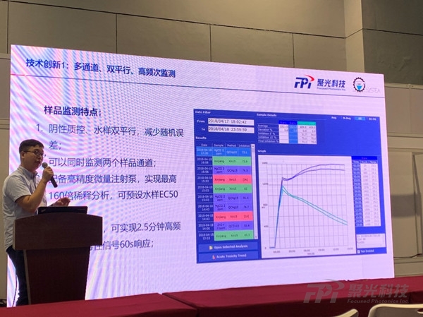 在此次2019上海水展上,聚光科技从水环境的监测技术和装备支撑为展示目标,展会重点展出了水环境监测监管综合解决方案、河长制解决方案、水污染源监测管理解决方案等创新成果。聚光科技联合意大利希思迪公司针对性的展出了Micromac C水质在线分析仪、Wiz水质原位分析仪。聚光科技(杭州)股份有限公司环境资源事业部水研究部工程师周兴鹏就《水质特征因子监测-综合生物毒性及应用分析》做现场汇报。