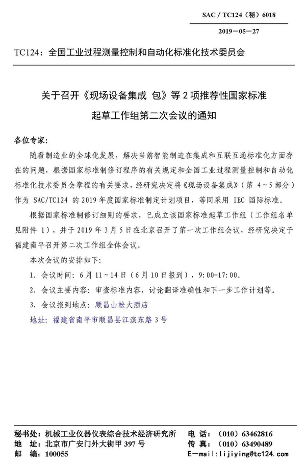 2019年6月11日-14日,由全国工业过程测量控制和自动化标准化技术委员会发起的《现场设备集成》(第 4~5部分《现场设备集成包》和《现场设备集成信息模型》)等两项国家智能制造标准第二次会议在福建顺昌虹润公司隆重召开,其中《现场设备集成包》一项标准由虹润公司主持起草制定。