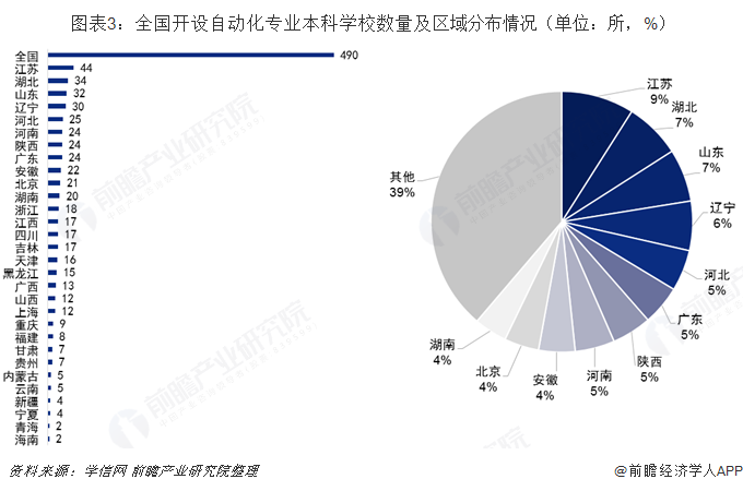 从开设自动化专业情况来看,全国共有490所本科高校开设自动化专业,其中,江苏省有44所高校开设该专业,在全国数量排名第一;此外,湖北省、山东省和辽宁省开设该专业的本科高校均在30所及以上。