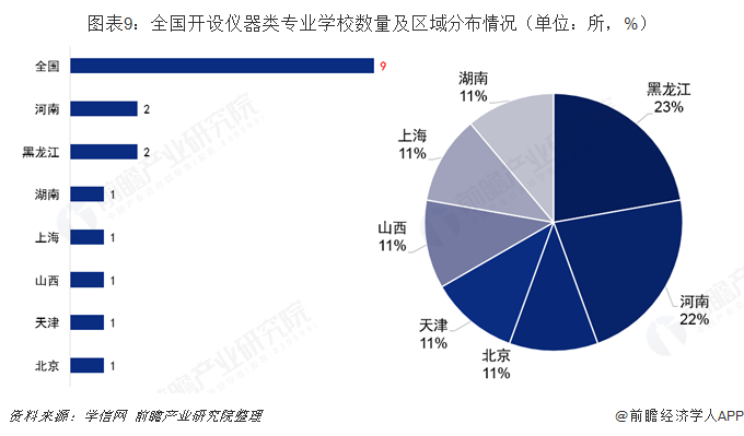 全国共有9所高校开设仪器类专业,其中,河南省和黑龙江省均有2所高校开设了该专业,湖南、上海、山西、天津、北京各有1所高校开设了该专业。