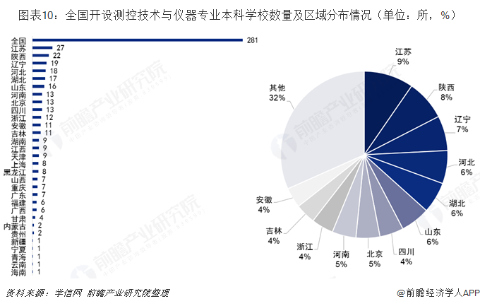 从开设测控技术与仪器专业情况来看,全国共有281所本科高校开设测控技术与仪器专业,其中,江苏省有27所高校开设该专业,在全国数量排名第一;其次,陕西省开设该专业的本科高校为22所,位居第二。