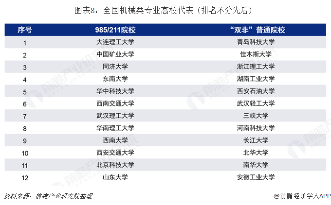 前瞻结合全国开设机械类专业高校的办学质量及毕业生的社会认可度,对开设了机械类专业的知名高校进行列示: