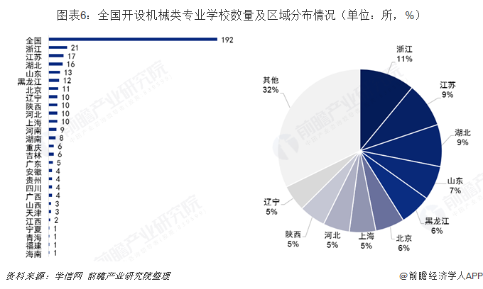 从开设的专业类来看,全国共有192所高校开设机械类专业,其中,浙江省有21所高校开设了该专业,位居全国第一;江苏省17所、湖北省16所位居其后。