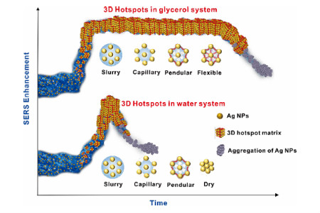 前期,杨良保研究员课题组通过溶剂蒸发诱导纳米粒子自组装,发展了一种动态表面增强拉曼光谱(D-SERS) 方法——利用溶液蒸发过程中形成的三维热点矩阵,实现SERS的高灵敏响应。然而,由于水溶液蒸发速率快速,导致三维热点存在时间短,稳定性差。因此,针对这些问题,杨良保研究员等提出了一种利用甘油构建长周期、高稳定表面增强拉曼三维热点矩阵的方法。该方法使三维Ag NPs热点矩阵数量增加,SERS检测灵敏度大大提升,实现了纳摩尔水平海洋生物毒素、农残、毒品等的高灵敏、稳定检测。构筑的长周期、高稳定三维热点,减少了由水体系热点存在时间短而引起的偶然因素的发生,使实验更具可操作性,在实际犯罪现场分析、医学诊断、食品安全等诸多领域的应用前景更加广阔。