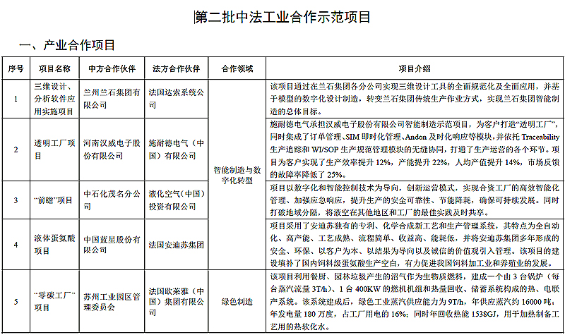 第二批中法工业合作示范项目包括智能制造、绿色制造等领域7个产业合作项目和2个教育培训合作项目。这些项目是中法企业、高校等机构发挥互补优势开展的合作项目,具有较好的创新性、代表性,欢迎中法工业界借鉴学习,推动中法工业合作取得更多务实成果,河南汉威电子股份有限公司与法国施耐德电气(中国)有限公司合作的透明工厂项目成功获批。