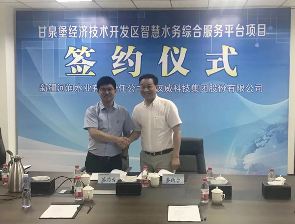 2019年7月3日上午12:00,新疆河润水业有限责任公司与汉威科技集团股份有限公司在新疆河润水业五楼会议室举行了“甘泉堡经济技术开发区智慧水务综合服务平台项目”签约仪式。