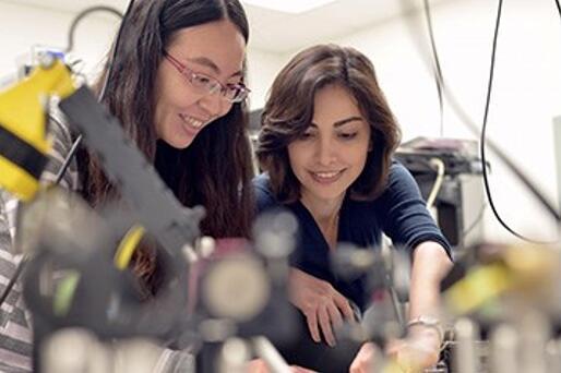 第一作者王宁(左)和美国光学学会会士(OSA Fellow)兼加州大学洛杉矶分校教授Mona Jarrahi,以及她们研发的太赫兹探测器装置