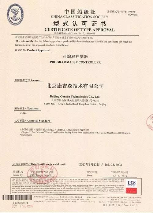 北京康吉森自主知识产权产品TSxPlus系统于近期顺利通过中国船级社(CCS)认证,并取得了CCS颁发的中国船级社型式认可证书。