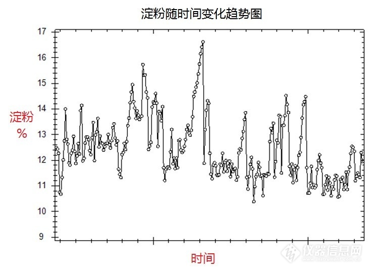 该系统从分析探头接收到的光信号,经过光纤传输到仪表单元内,转化成为光谱信号,该光谱信号传输给在线分析软件后,通过近红外检测模型的演算得到测量值,该测量值回传给仪表单元,在仪表单元转化为控制信号后,通过电缆传送给中控系统,用于在线调控。下图6展示的是在线连续监测淀粉的趋势结果。该系统已经成功应用于其配粮系统,并获得省科技进步奖。