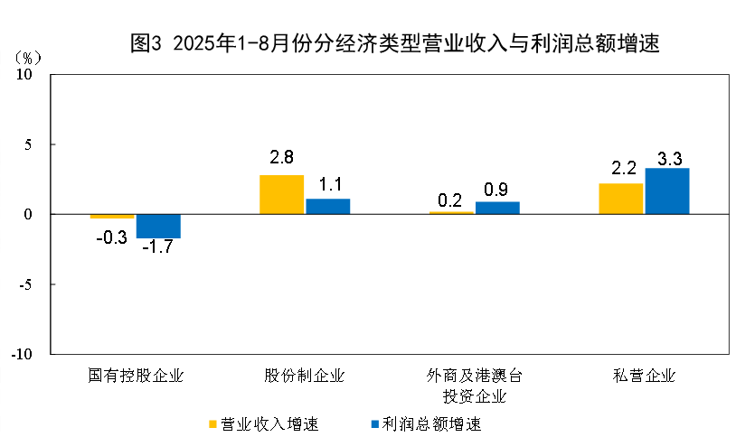 1—8月份,规模以上工业企业中,国有控股企业实现利润总额15156.5亿元,同比下降1.7%;股份制企业实现利润总额34931.9亿元,增长1.1%;外商及港澳台投资企业实现利润总额11723.6亿元,增长0.9%;私营企业实现利润总额13076.1亿元,增长3.3%。
