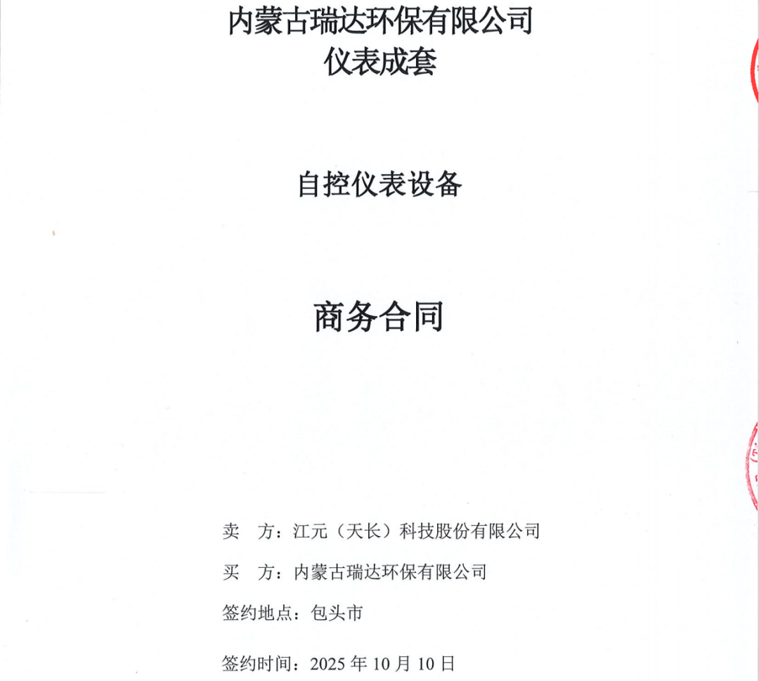 10月10日,江元科技成功签约内蒙古瑞达环保有限公司仪表成套供货合同。本次项目中,江元科技将为瑞达环保提供包括84台PRS雷达液位计、56台WDM在线水质分析仪表、28台WDM压力开关,以及91套JY系列电磁流量计在内的全套自动化仪表解决方案。