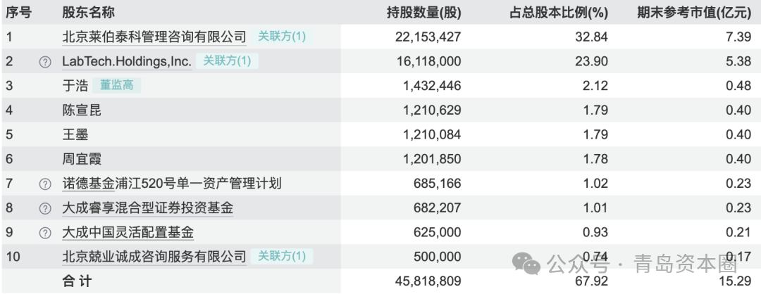 截至 2025 年半年度报告期末,莱伯泰科股东总数为3635户。从主要股东来看,北京莱伯泰科管理咨询有限公司为公司控股股东,持股数量 2215.34 万股,持股比例 32.84%;LabTech Holdings, Inc. 为第二大股东,持股 1611.80 万股,持股比例 23.90%;此外,于浩、陈宣昆、王墨等自然人股东及诺德基金、大成基金等机构股东也持有一定比例股份。青岛市创新投资有限公司本次战略入股后,将成为公司第三大股东。