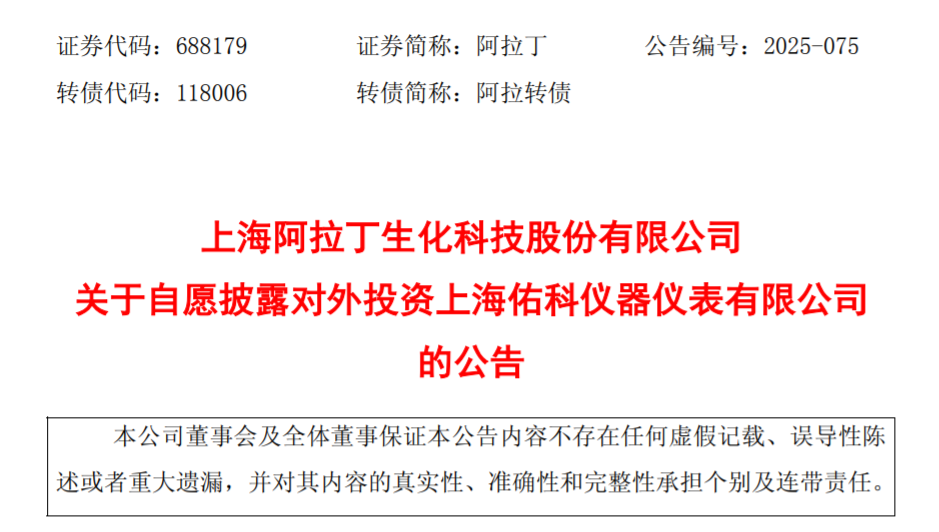 2025年11月27日,阿拉丁发布关于自愿披露对外投资上海佑科仪器仪表有限公司的公告。