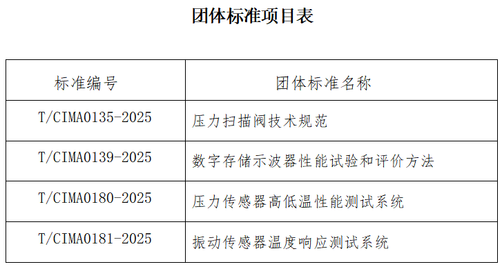 按照《中国仪器仪表行业协会团体标准管理办法(2020 年修订版)》和《中国仪器仪表行业协会团体标准制定工作细则(2020 年修订版》,中国仪器仪表行业协会已组织有关单位完成《压力扫描阀技术规范》等4项团体标准的制定工作,现批准发布,实施日期为2026年3月28日。