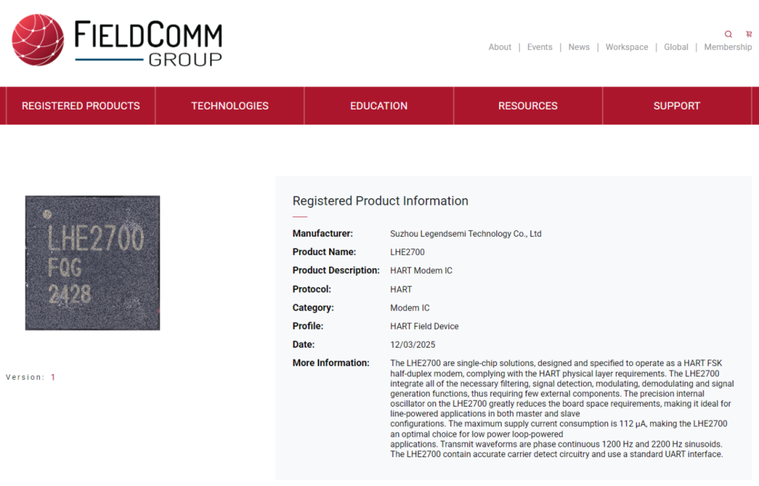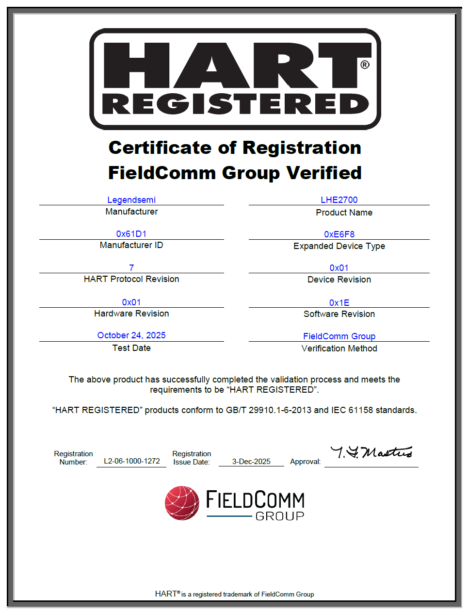 近日,领慧立芯旗下LHE2700 集成精密振荡器的低功耗 HART 调制解调器,成功通过国际权威机构 FieldComm Group 的 HART® 通信协议认证。这一里程碑式的突破,不仅标志着 LHE2700 在工业通信协议兼容性、技术可靠性上达到国际标准,更意味着国产工业级模拟芯片在关键领域实现了与国际先进水平的精准对标,为工业自动化设备的国产化升级注入强劲 “芯” 动力。