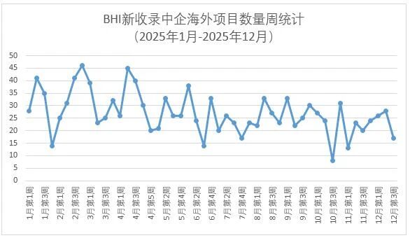 据BHI中企海外项目数据库监测,12月15日-19日BHI新收录中企新签约/中标/公告海外项目17个,较此前有所回落。2025年新收录项目超过1320个。近一年每周新收录项目数量趋势统计详见下图。