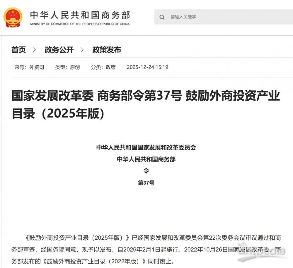 近日,经国务院同意,国家发展改革委、商务部全文发布《鼓励外商投资产业目录(2025年版)》(以下简称《鼓励目录》),自2026年2月1日起施行。