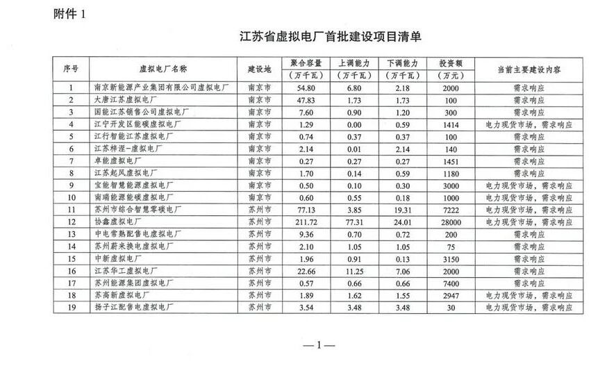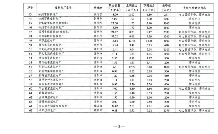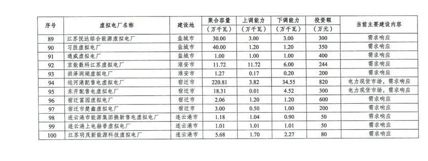 江苏省首批建100个虚拟电厂项目,总聚合容量达16.98GW,上调能力2.75GW,下调能力3.17GW,涉及总投资额12.73亿元;主要建设内容为电力现货市场及需求响应。