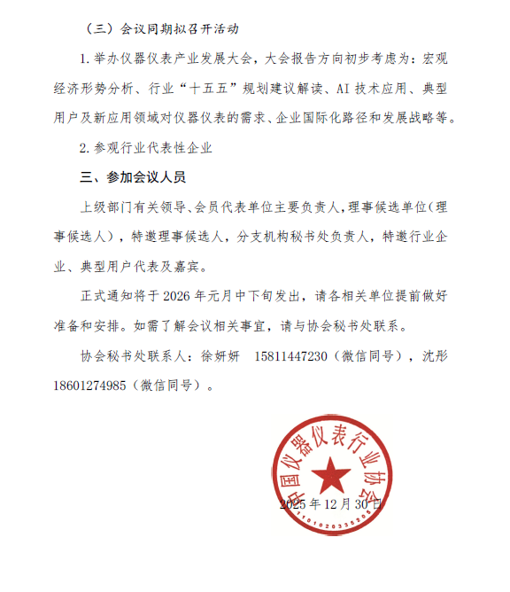 根据《中国仪器仪表行业协会章程》规定,经中国仪器仪表行业协会(以下简称协会)换届工作领导小组研究决定,定于2026 年3月8-10 日召开协会第九届会员代表大会。现将会议有关事项预通知如下: