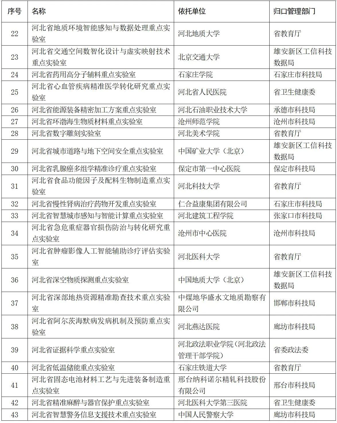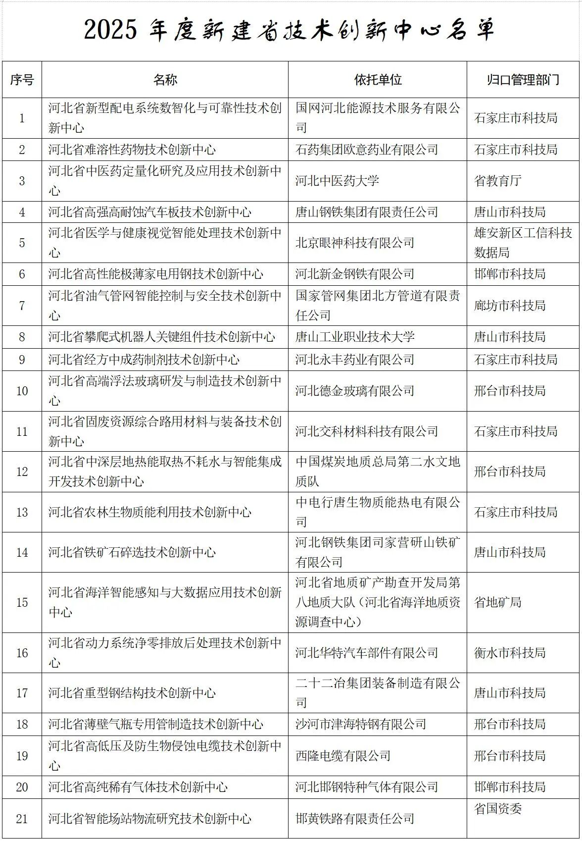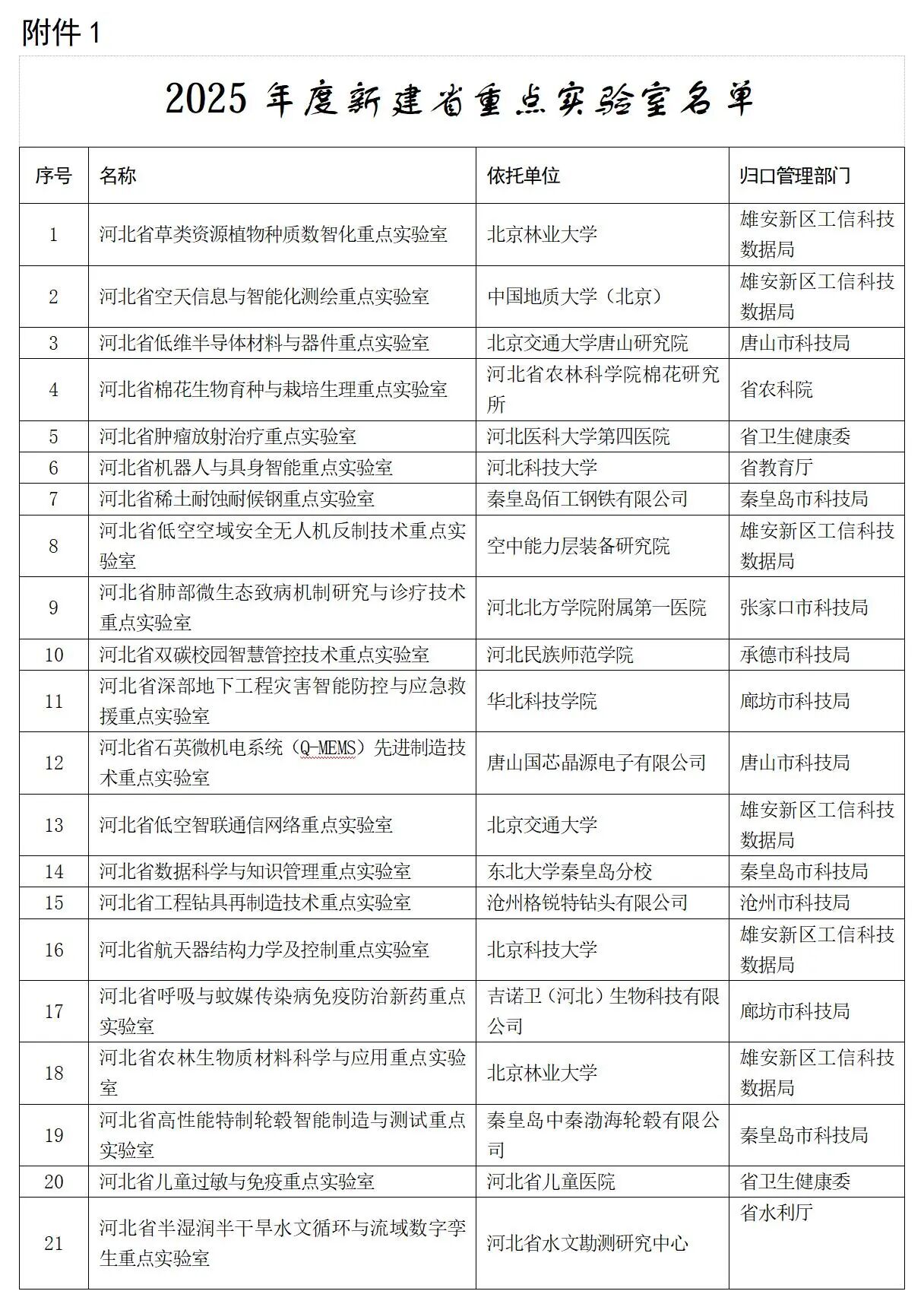 河北省科学技术厅关于公布2025年新建省重点实验室和省技术创新中心名单的通知