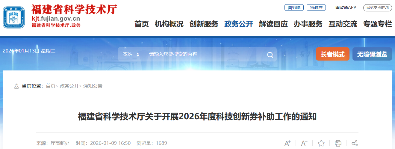 福建省科学技术厅关于开展2026年度科技创新券补助工作的通知