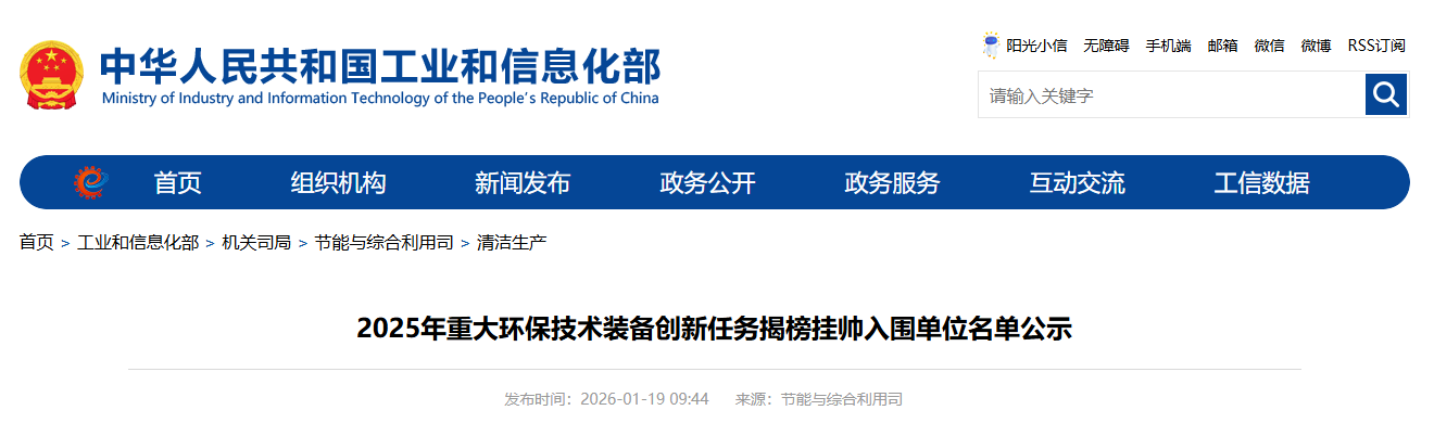 工业和信息化部根据《关于组织开展2025年重大环保技术装备创新任务揭榜挂帅工作的通知》(工信厅节函〔2025〕399号)要求,经自愿申报、省级工业和信息化主管部门推荐、专家评审,遴选确定了2025年重大环保技术装备创新任务揭榜挂帅入围单位名单,现已发布公示名单。
