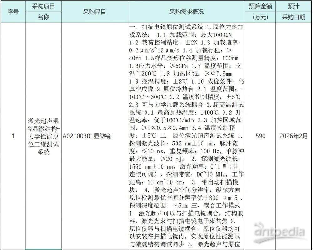 本次采购的“激光超声耦合显微结构-力学性能原位三维测试系统”技术集成度高、指标先进。该系统要求能够与扫描电镜深度耦合,在微观尺度下(如扫描电镜腔内)实现对材料在极端条件(如-100℃至1400℃温度范围、高达5GPa的应力水平)下的力学行为进行实时、原位观测,并同步结合激光超声技术进行亚表面缺陷与性能的无损检测与三维成像。该系统的引入,将为新材料研发、微观力学机制研究等前沿领域提供前所未有的“洞察力”。