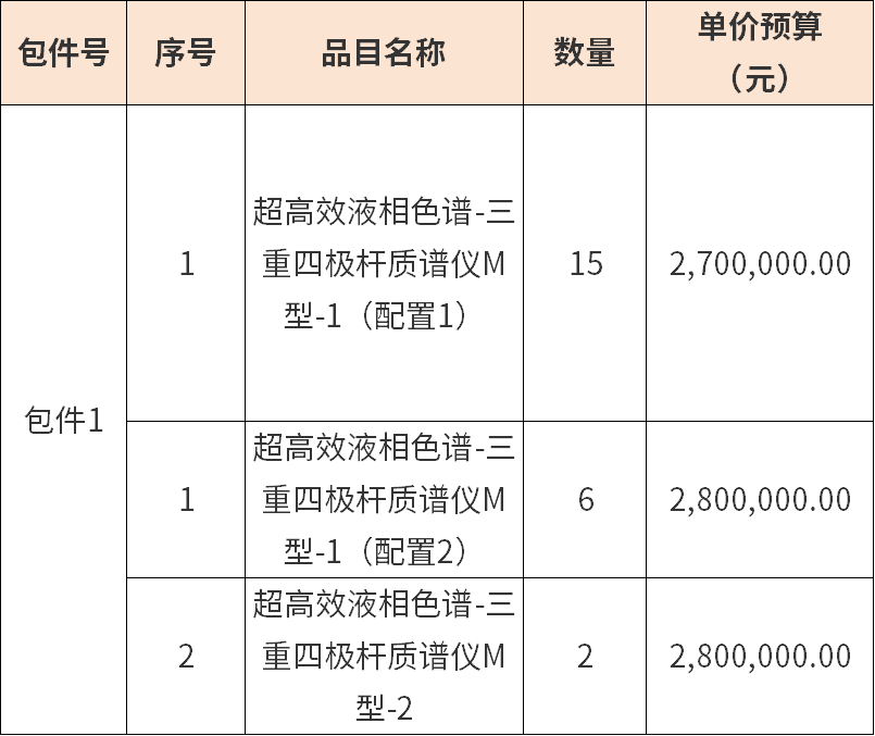 根据公告信息,采购超高效液相色谱-三重四极杆质谱仪M型-1(配置1)15台套,超高效液相色谱-三重四极杆质谱仪M型-1(配置2)6台套,超高效液相色谱-三重四极杆质谱仪M型-2采购2台套。产品需交付至海关指定地点,时间不得超过正式签订合同后30个日历日,并提供为期三年的质保服务。