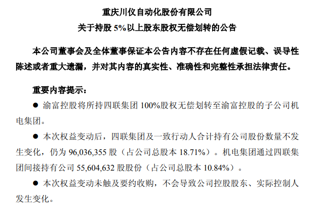 近日,公司收到四联集团转发的重庆市国资委《关于同意重庆渝富控股集团有限公司无偿划转所持中国四联仪器仪表集团有限公司100%股权的批复》,同意渝富控股以2025年12月31日为基准日,将持有四联集团100%股权无偿划转至机电集团。本次权益变动完成后,前述《委托管理协议》终止,机电集团由受托管理四联集团,变更为直接持有四联集团100%股权,并通过四联集团间接持有公司10.84%股份,本次权益变动不涉及四联集团及其一致行动人合计持有公司股份数量的变化。