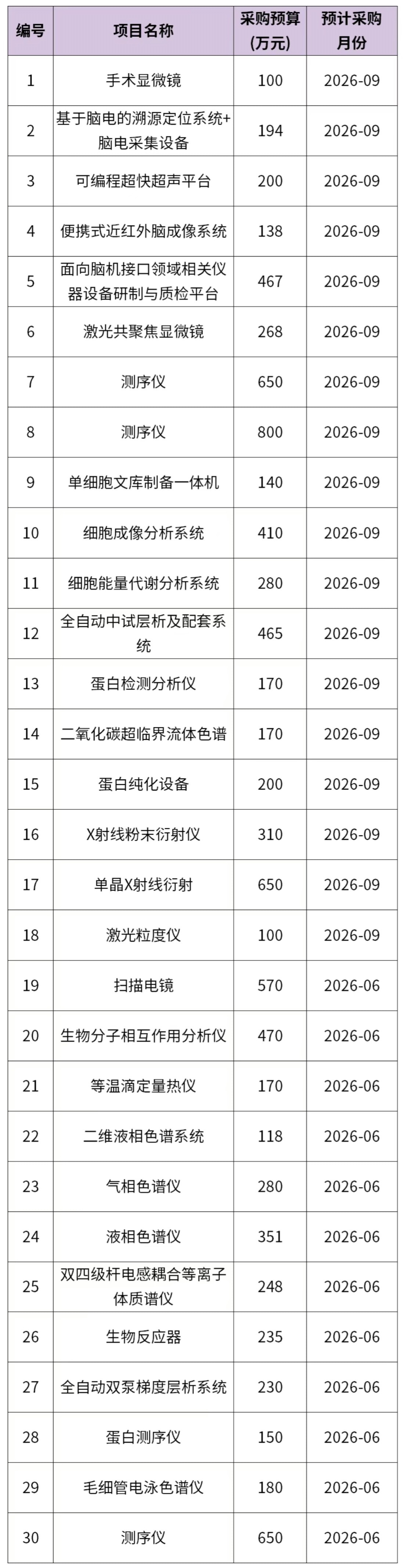 南京医科大学(本部)2026年2月(第2批)政府采购意向公告发布,计划于2026年6月、9月购置手术显微镜、激光共聚焦显微镜、测序仪、蛋白纯化设备、扫描电镜、气相色谱仪、液相色谱仪、双四级杆电感耦合等离子体质谱仪等仪器设备,预算总额9364万元。