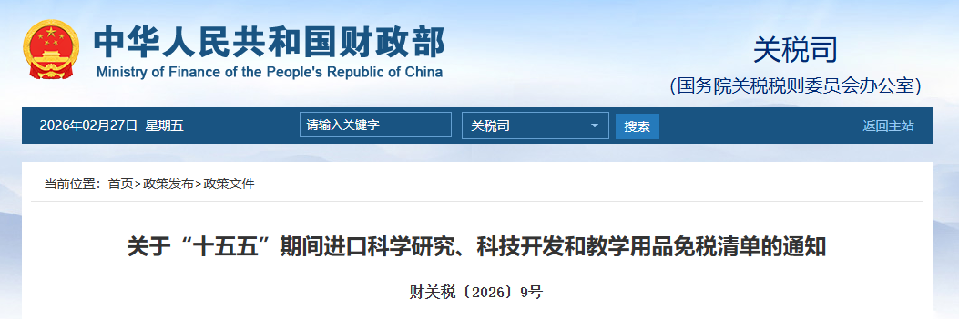 根据《财政部 海关总署 税务总局关于“十五五”期间支持科技创新进口税收优惠政策的通知》(财关税〔2026〕7号)和《财政部 中央宣传部 国家发展改革委 教育部 科技部 工业和信息化部 民政部 商务部 文化和旅游部 国家卫生健康委 海关总署 税务总局关于“十五五”期间支持科技创新进口税收优惠政策管理办法的通知》(财关税〔2026〕8号)有关规定,现将“十五五”期间进口科学研究、科技开发和教学用品免税清单(见附件)予以公布,自2026年1月1日起实施。