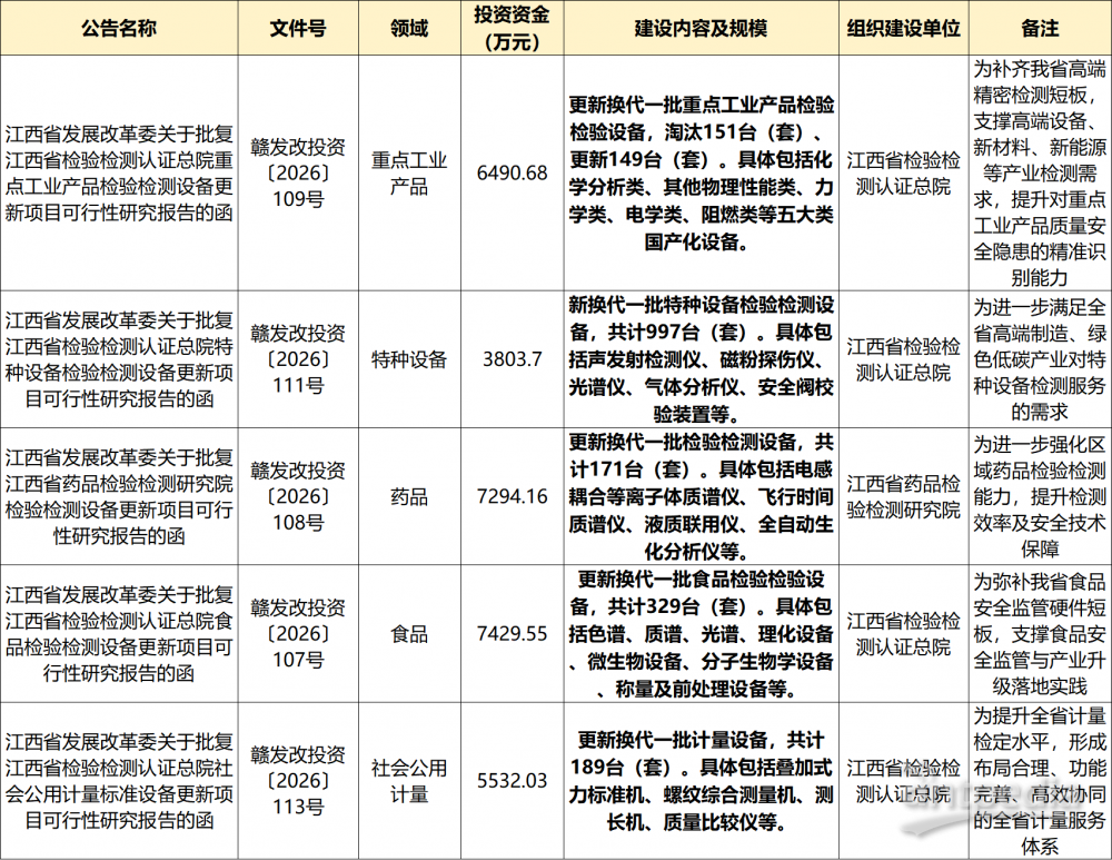 近日,江西省发展改革委密集批复重点工业产品、特种设备、药品、食品、社会公用计量五大领域检验检测设备更新项目,总投资达28769.42 万元,旨在全面提升全省质量安全保障能力,支撑高端制造、绿色低碳等重点产业高质量发展。