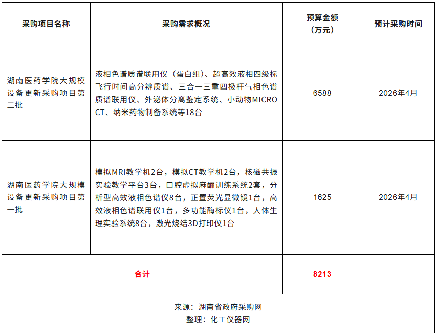 近日,湖南医药学院公布2026年2季度采购意向,计划采购液相色谱质谱联用仪、外泌体分离鉴定系统、核磁共振实验教学平台、分析型高效液相色谱仪、正置荧光显微镜、多功能酶标仪等47台仪器设备,预算总金额8213万元。预计采购时间2026年4月。