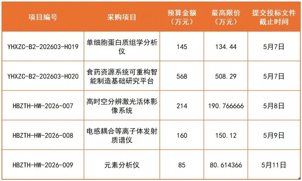 近日,武汉轻工大学生科院大型仪器设备平台设备更新项目项目已正式启动公开招标。本次采购涵盖单细胞蛋白质组学分析仪、食药资源系统可重构智能制造基础研究平台、高时空分辨激光活体影像系统、电感耦合等离子体发射质谱仪及元素分析仪等多套高端科研设备,整体预算金额达1172万元,项目最早投标截止时间为5月7日。