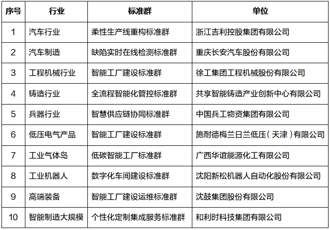 在本次会议上,发布了首批“智能制造标准应用试点”十大标准群成果。具体如下: