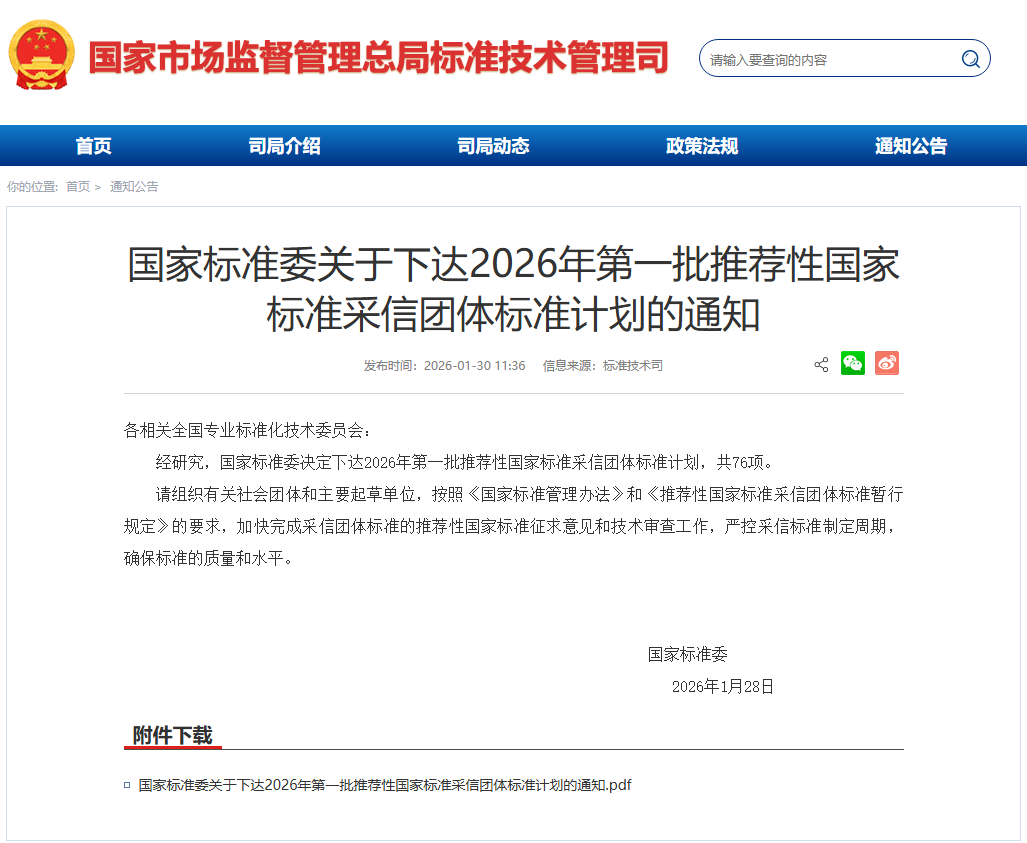 随着《社会团体登记管理条例》修订版正式施行,国家标准化管理委员会同步下达《2026年第一批推荐性国家标准采信团体标准计划》,76项团体标准正式纳入推荐性国家标准计划。