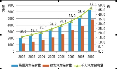 截止到2009年底,我国人均汽车保有量仅为47.8辆/千人,相当于美国1917年、日本1964年、韩国1988年的水平,在考虑人均GDP的情况下,我国汽车保有量仍处于世界较低水平。即使中国未来发展速度减缓,在较长时间里达不到美日韩的水平,只达到世界平均水平,比如达到2007年全球144辆/千人的水平,目前的产销量也将翻一番,汽车市场潜在容量巨大。