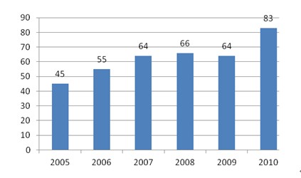 图14:2005-2010我国消费电子行业传感器销售额(亿元)