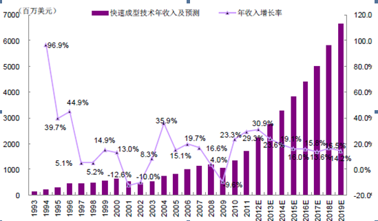 花旗银行最新发布了一份研究报告3,将3D 打印产业视作将改变世界的十大技术发明,并预计3D 打印产业将在航天、整形等高附加值、小体量的产业领域率先爆发。专业研究机构Wohlers 发布的报告预期,3D 打印产业未来仍将持续较快地增长,到2015 年,包含设备制造和服务在内的产业总产值将达到31 亿美元,2019 年将超越65 亿美元。