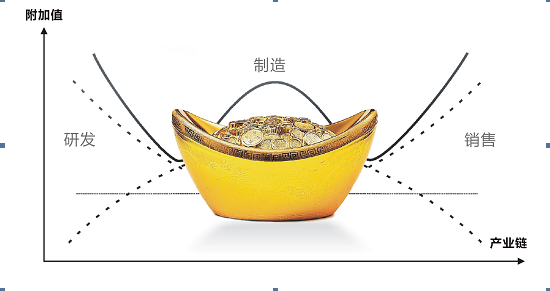 国智造”的华丽转身。根据“微笑曲线”理论,产品的附加值更多体现在两端,即设计和销售,处于中间环节的制造的附加值最低。但是在高精尖制造业领域,却呈现出“倒微笑曲线”,即高附加值主要来自于高度自动化、精益化的制造环节,研发和营销的附加值屈居其次。二者叠加形成“元宝曲线”,实现了集成专业化和制造专业化的价值共生,使得企业盈利模式多样化,盈利点和价值分布点增多,通过相关业务之间的协同,能够实现“1+1>2”的目标。