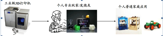 工业生产方式的变革与消费者行为存在交互影响,消费需求的转变往往能推动工业的创新变革,而工业生产方式根本转变之后又反过来使消费习惯固定。近年来,国外消费者个性化定制的诉求日益强化,现代工业流水线生产模式引以为傲的标准化产品越来越难调众味。3D 打印这种基于网络平台,以3D 打印机为生产终端的技术,恰恰能满足大众(特别是不具备产品开发能力的消费者)的多样化需求。下一步,也是西方国家正在做的事情,通过传媒宣传、体验馆展示在消费者群体中推广新技术,影响消费者选择,使3D 打印加速形成新兴产业。