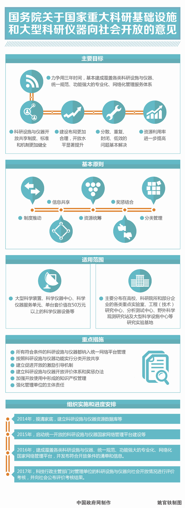 近日,国务院发布《国务院关于国家重大科研基础设施和大型科研仪器向社会开放的意见》,图解如下: