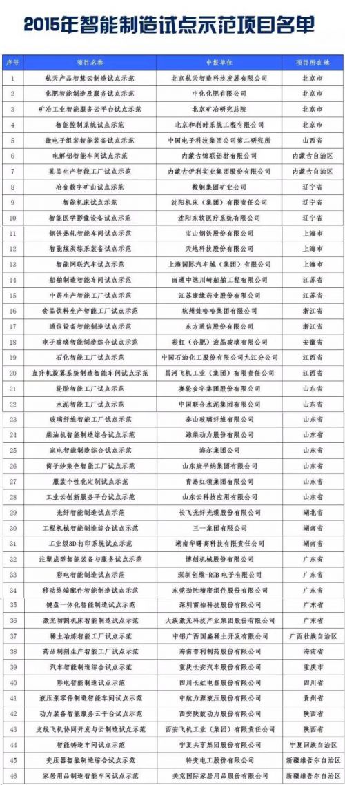 近日,工业和信息化部公布2015年智能制造试点示范项目名单,共有46个项目上榜,覆盖了38个行业,分布在21个省(自治区、直辖市),涉及流程制造、离散制造、智能装备和产品、智能制造新业态新模式、智能化管理、智能服务等6个类别。详情如下。
