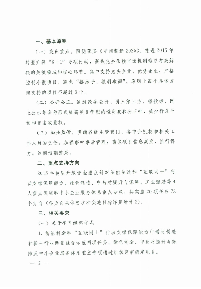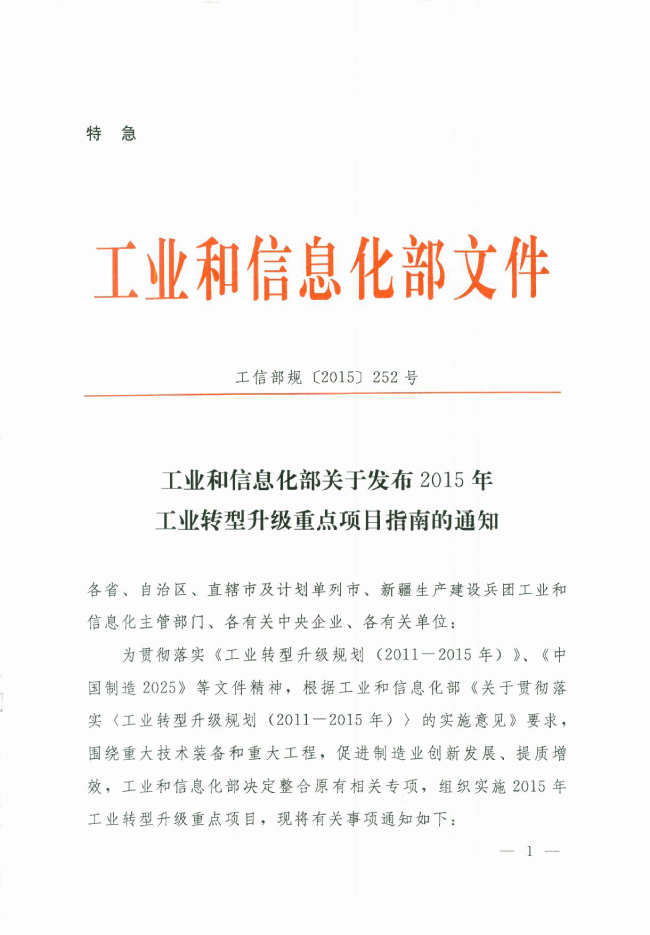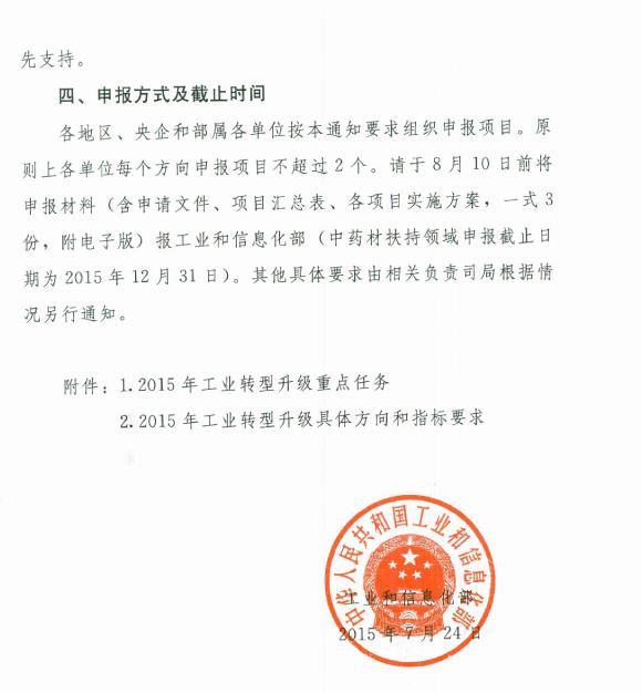 7月27日,工信部发布关于2015年工业转型升级重点项目指南的通知。根据通知,2015年转型升级资金重点针对智能制造和“互联网 ”行动支撑保障能力、绿色制造、中药材提升与保障、工业强基等4大重点领域和中小企业服务体系重点专项,共实施20项任务73个方向。