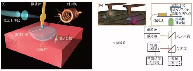 图1 (a)MRFM原理图;(b)基于金刚石NV色心的AFM光探测磁共振技术原理图