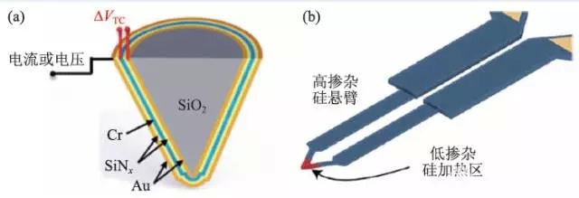 图2 (a)集成热电偶和导电层的SThM探针原理图(ΔVTC 为热电势);(b)HT-AFM的“热源”探针的基本原理图