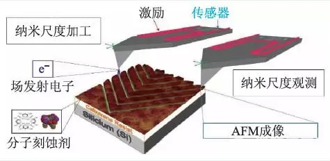 在微纳米尺度上对微悬臂的激励和检测方式是多种多样的, 可利用如压电效应、电容效应、热双金属片效应、压阻效应等。目前,利用微纳加工手段将微悬臂的激励装置和形变检测装置都直接集成一体,成为自激励、自检测式阵列化探针,它们的应用大大提高了SPL 技术的通量,使得实现高效率大面积的纳米级高分辨率刻蚀成为了可能。