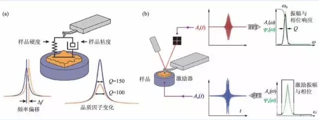 图6 (a)AFM探针—样品接触的Kelvin—Voigt力学模型;(b)频带激励模式的原理示意图