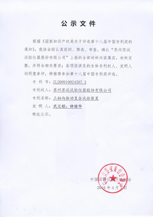公示:推荐苏试三轴向振动复合试验装置参评第十八届中